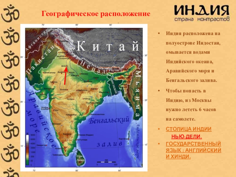 Индия расположена на полуострове Индостан, омывается водами Индийского океана, Аравийского моря