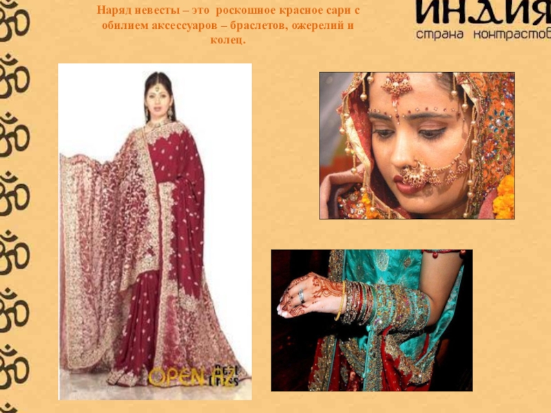 Наряд невесты – это роскошное красное сари с обилием аксессуаров –