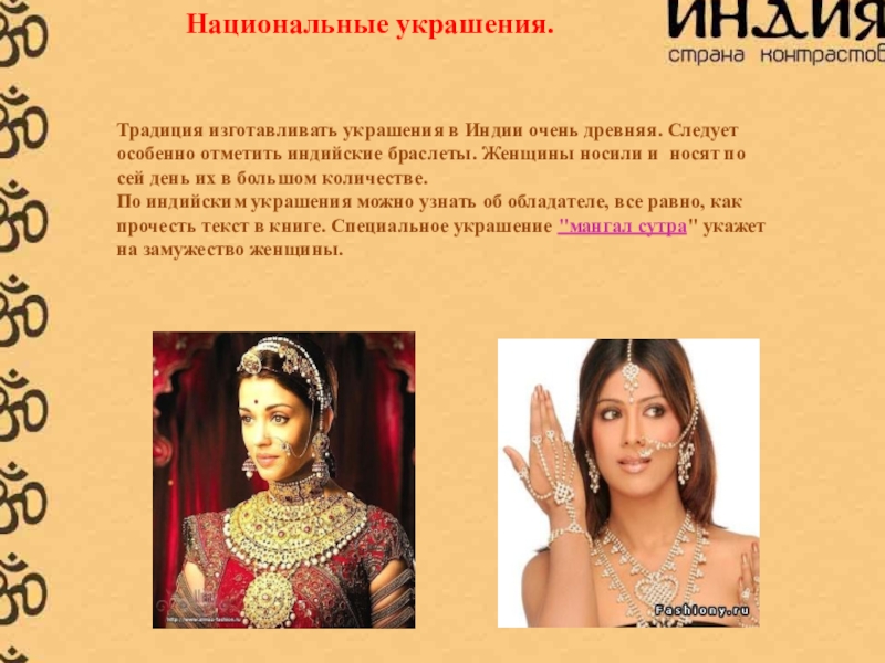 По индийским украшения можно узнать об обладателе, все равно, как прочесть текст в книге. Специальное украшение "мангал сутра" укажет на замужество женщины.