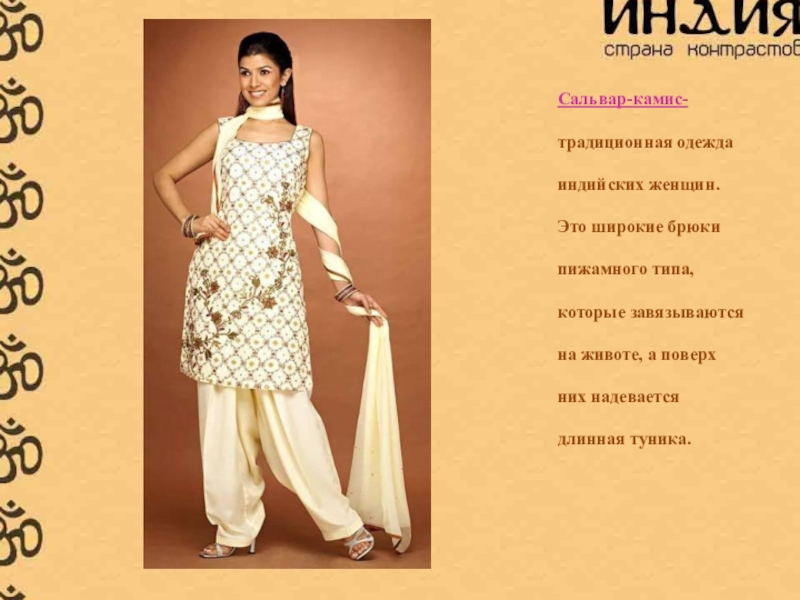 Сальвар-камис- традиционная одежда индийских женщин. Это широкие брюки пижамного типа, которые