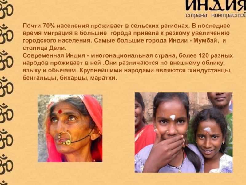Современная Индия - многонациональная страна, более 120 разных народов проживает в ней .Они различаются по внешнему облику, языку и обычаям. Крупнейшими народами являются :хиндустанцы, бенгальцы, бихарцы, маратхи.