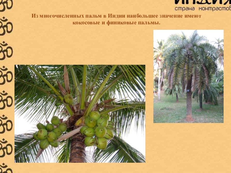 Из многочисленных пальм в Индии наибольшее значение имеют кокосовые и финиковые