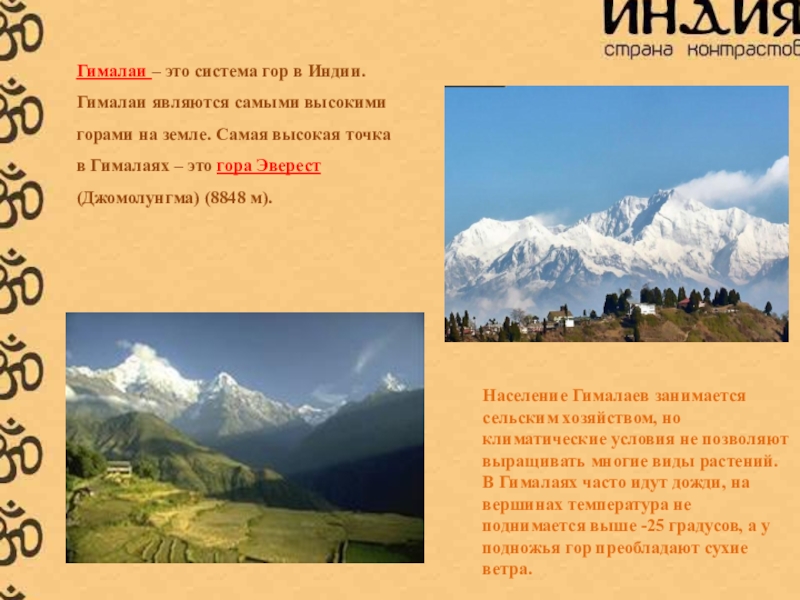 Гималаи – это система гор в Индии. Гималаи являются самыми высокими