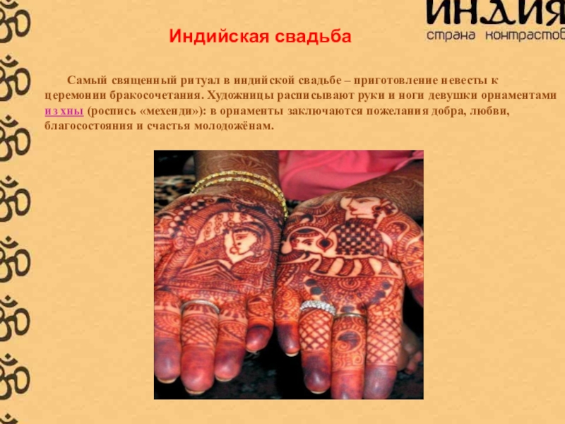 – приготовление невесты к церемонии бракосочетания. Художницы расписывают руки и ноги девушки орнаментами из хны (роспись «мехенди»): в орнаменты заключаются пожелания добра, любви, благосостояния и счастья молодожёнам.