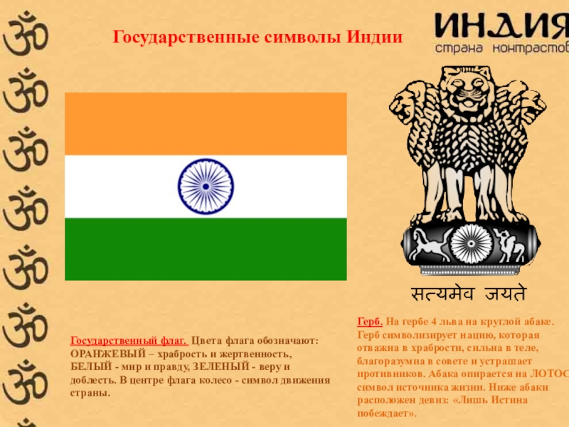 Государственный флаг. Цвета флага обозначают: ОРАНЖЕВЫЙ – храбрость и жертвенность, БЕЛЫЙ - мир и правду, ЗЕЛЕНЫЙ - веру и доблесть. В центре флага колесо - символ движения страны.