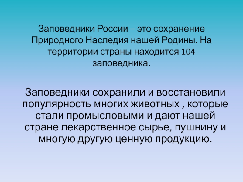 Заповедники сохранили и восстановили популярность многих животных , которые стали промысловыми и дают нашей стране лекарственное сырье, пушнину и многую другую ценную продукцию.