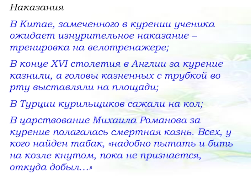 В царствование Михаила Романова за курение полагалась смертная казнь. Всех, у кого найден табак, «надобно пытать и бить на козле кнутом, пока не признается, откуда добыл…»