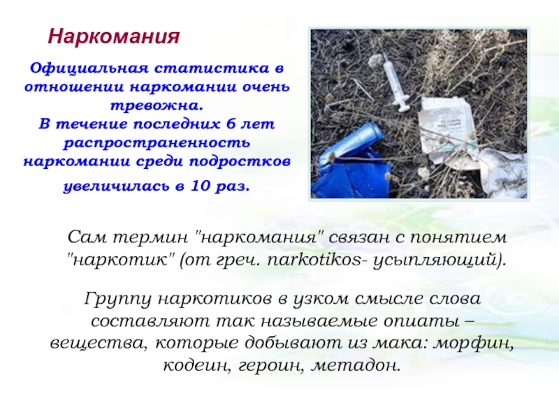 Группу наркотиков в узком смысле слова составляют так называемые опиаты – вещества, которые добывают из мака: морфин, кодеин, героин, метадон.