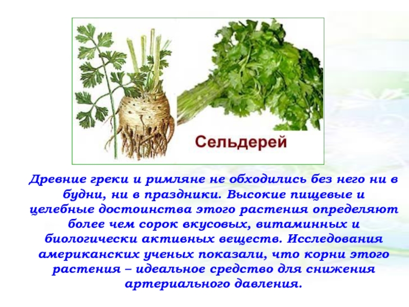 ни в праздники. Высокие пищевые и целебные достоинства этого растения определяют более чем сорок вкусовых, витаминных и биологически активных веществ. Исследования американских ученых показали, что корни этого растения – идеальное средство для снижения артериального давления.