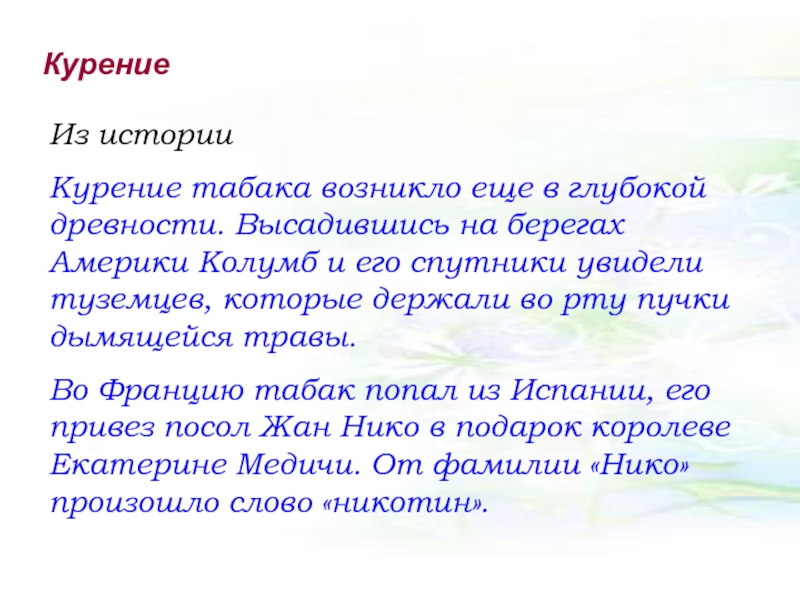Во Францию табак попал из Испании, его привез посол Жан Нико в подарок королеве Екатерине Медичи. От фамилии «Нико» произошло слово «никотин».