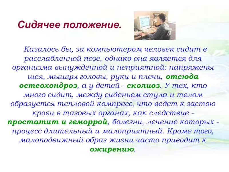 Слайд 34Казалось бы, за компьютером человек сидит в расслабленной позе, однако она