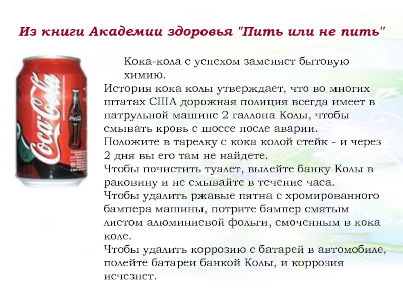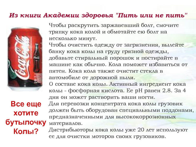 О составе кока колы. Активный ингредиент кока колы - фосфорная кислота. Ее рН равен 2.8. За 4 дня он может растворить ваши ногти.