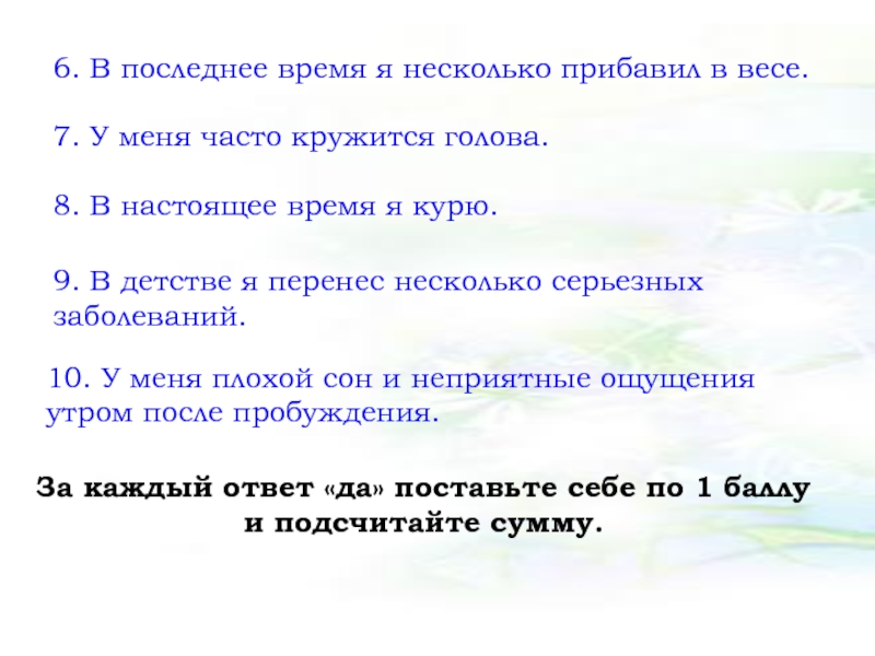За каждый ответ «да» поставьте себе по 1 баллу и подсчитайте сумму.