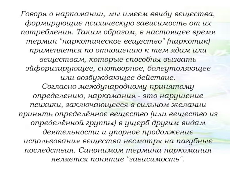Слайд 32Говоря о наркомании, мы имеем ввиду вещества, формирующие психическую зависимость от