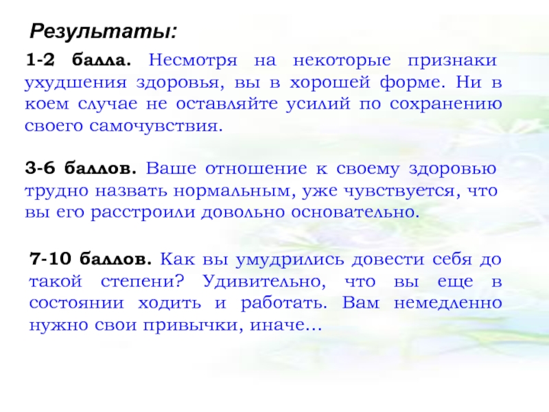 3-6 баллов. Ваше отношение к своему здоровью трудно назвать нормальным, уже чувствуется, что вы его расстроили довольно основательно.