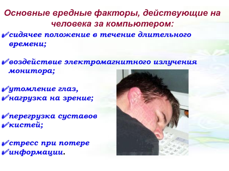 Основные вредные факторы, действующие на человека за компьютером: