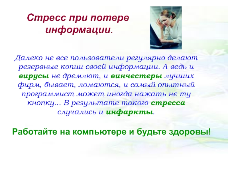ведь и вирусы не дремлют, и винчестеры лучших фирм, бывает, ломаются, и самый опытный программист может иногда нажать не ту кнопку... В результате такого стресса случались и инфаркты.