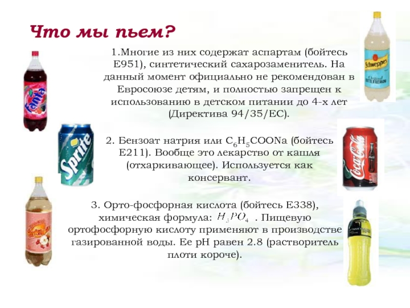 Слайд 81.Многие из них содержат аспартам (бойтесь Е951), синтетический сахарозаменитель. На данный