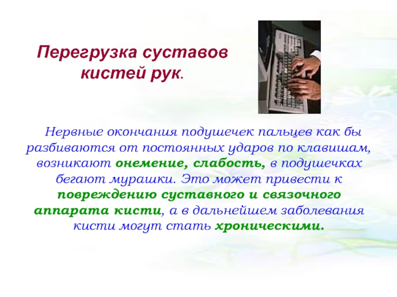 клавишам, возникают онемение, слабость, в подушечках бегают мурашки. Это может привести к повреждению суставного и связочного аппарата кисти, а в дальнейшем заболевания кисти могут стать хроническими.