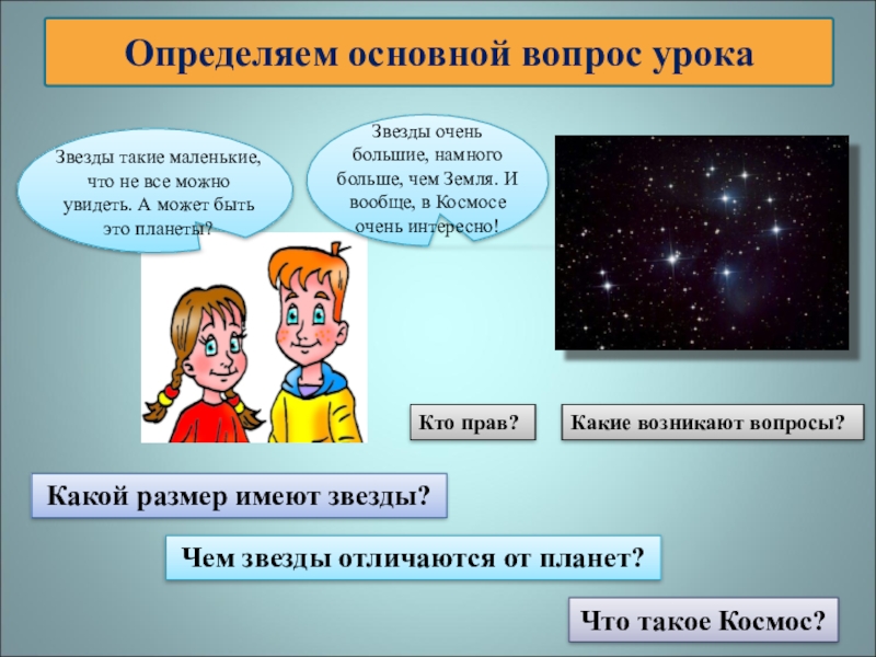 Звезды очень большие, намного больше, чем Земля. И вообще, в Космосе очень интересно!