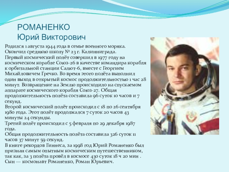 моряка. Окончил среднюю школу № 23 г. Калинниграда.  Первый космический полёт совершил в 1977 году на космическом корабле Союз-26 в качестве командира корабля к орбитальной станции Салют-6, вместе с Георгием Михайловичем Гречко. Во время этого полёта выполнил один выход в открытый космос продолжительностью 1 час 28 минут. Возвращение на Землю происходило на спускаемом аппарате космического корабля Союз-27. Общая продолжительность полёта составила 96 суток 10 часов и 7 секунд.  Второй космический полёт происходил с 18 по 26 сентября 1980 года. Этот полёт продолжался 7 суток 20 часов 43 минуты 24 секунды.  Третий полёт происходил с 5 февраля по 29 декабря 1987 года.  Общая продолжительность полёта составила 326 суток 11 часов 37 минут 59 секунд.  В книге рекордов Гиннеса, за 1998 год Юрий Романенко был признан самым опытным космическим путешественником, так как, за 3 полёта провёл в космосе 430 суток 18 ч 20 мин .  Сын — космонавт Романенко, Роман Юрьевич.