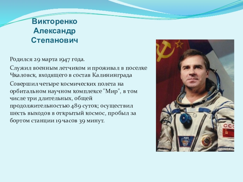 Викторенко Александр Степанович Родился 29 марта 1947 года. Служил военным летчиком и проживал в поселке Чкаловск, входящего в