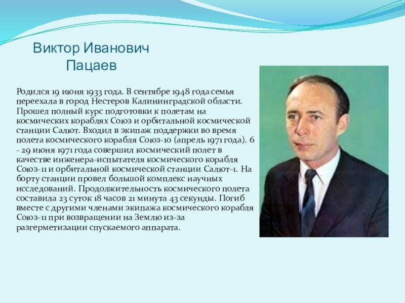 Виктор Иванович Пацаев Родился 19 июня 1933 года. В сентябре 1948 года семья переехала в город Нестеров