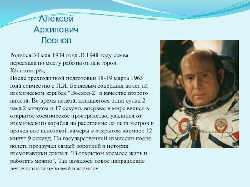 Алексей Архипович ЛеоновРодился 30 мая 1934 года .В 1948 году семья переехала по месту работы отца в город Калининград.  После трехгодичной подготовки 18-19 марта 1965 года совместно с П.И. Беляевым совершил полет на космическом корабле "Восход-2"