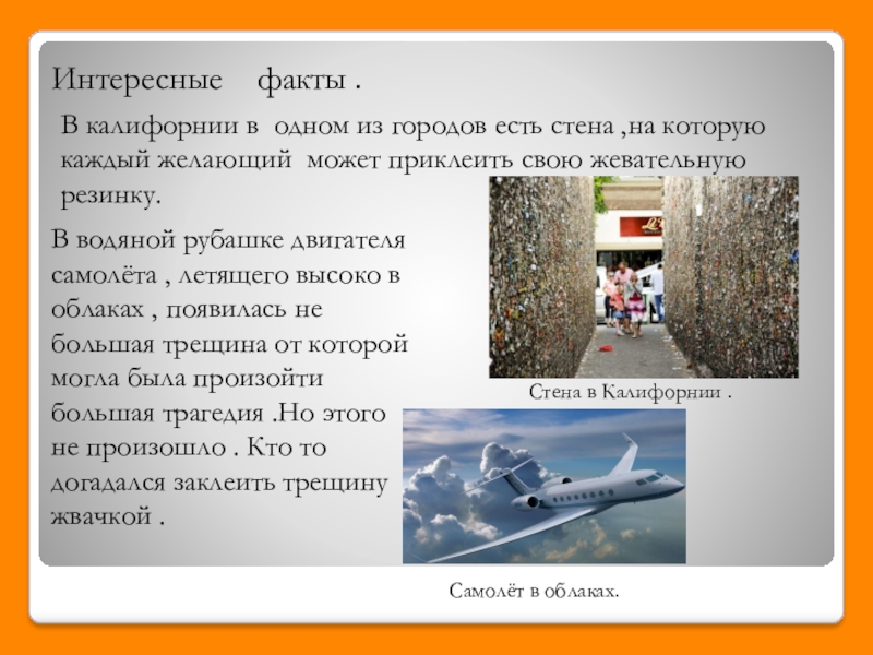 В водяной рубашке двигателя самолёта , летящего высоко в облаках , появилась не большая трещина от которой могла была произойти большая трагедия .Но этого не произошло . Кто то догадался заклеить трещину жвачкой .