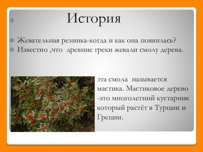 Эта смола называется мастика. Мастиковое дерево -это многолетний кустарник который растёт в Турции и Греции.