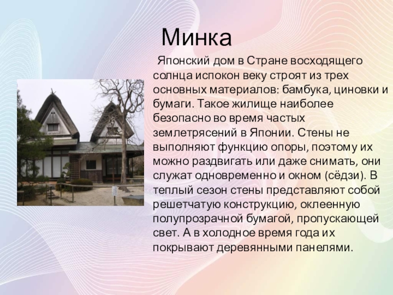 веку строят из трех основных материалов: бамбука, циновки и бумаги. Такое жилище наиболее безопасно во время частых землетрясений в Японии. Стены не выполняют функцию опоры, поэтому их можно раздвигать или даже снимать, они служат одновременно и окном (сёдзи). В теплый сезон стены представляют собой решетчатую конструкцию, оклеенную полупрозрачной бумагой, пропускающей свет. А в холодное время года их покрывают деревянными панелями.