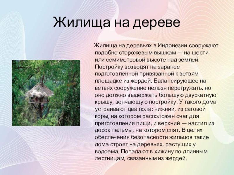подобно сторожевым вышкам — на шести- или семиметровой высоте над землей. Постройку возводят на заранее подготовленной привязанной к ветвям площадке из жердей. Балансирующее на ветвях сооружение нельзя перегружать, но оно должно выдержать большую двускатную крышу, венчающую постройку. У такого дома устраивают два пола: нижний, из саговой коры, на котором расположен очаг для приготовления пищи, и верхний — настил из досок пальмы, на котором спят. В целях обеспечения безопасности жильцов такие дома строят на деревьях, растущих у водоема. Попадают в хижину по длинным лестницам, связанным из жердей.