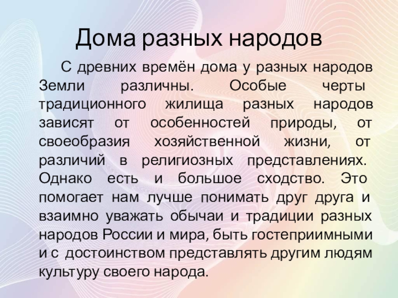разных народов Земли различны. Особые черты традиционного жилища разных народов зависят от особенностей природы, от своеобразия хозяйственной жизни, от различий в религиозных представлениях. Однако есть и большое сходство. Это помогает нам лучше понимать друг друга и взаимно уважать обычаи и традиции разных народов России и мира, быть гостеприимными и с достоинством представлять другим людям культуру своего народа.
