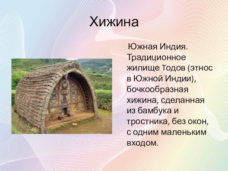 Южной Индии), бочкообразная хижина, сделанная из бамбука и тростника, без окон, с одним маленьким входом.