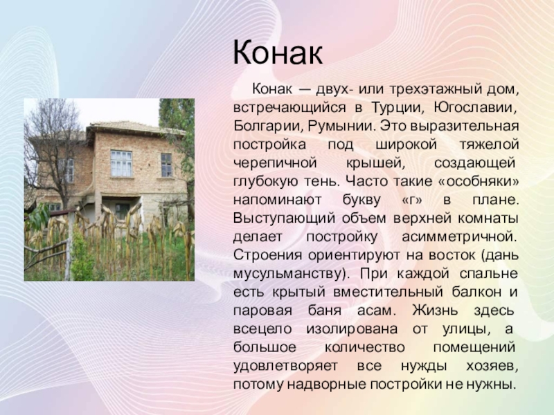 встречающийся в Турции, Югославии, Болгарии, Румынии. Это выразительная постройка под широкой тяжелой черепичной крышей, создающей глубокую тень. Часто такие «особняки» напоминают букву «г» в плане. Выступающий объем верхней комнаты делает постройку асимметричной. Строения ориентируют на восток (дань мусульманству). При каждой спальне есть крытый вместительный балкон и паровая баня асам. Жизнь здесь всецело изолирована от улицы, а большое количество помещений удовлетворяет все нужды хозяев, потому надворные постройки не нужны.