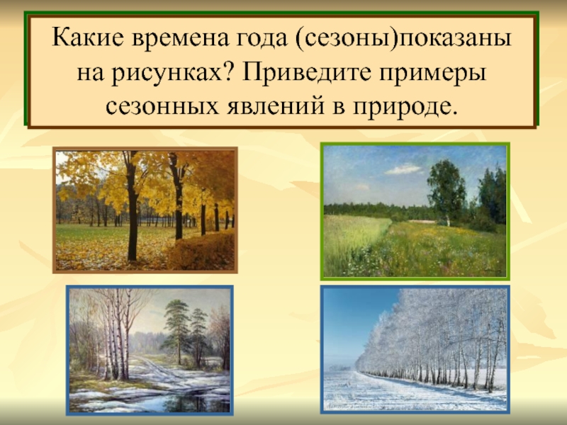 на рисунках? Приведите примеры сезонных явлений в природе.