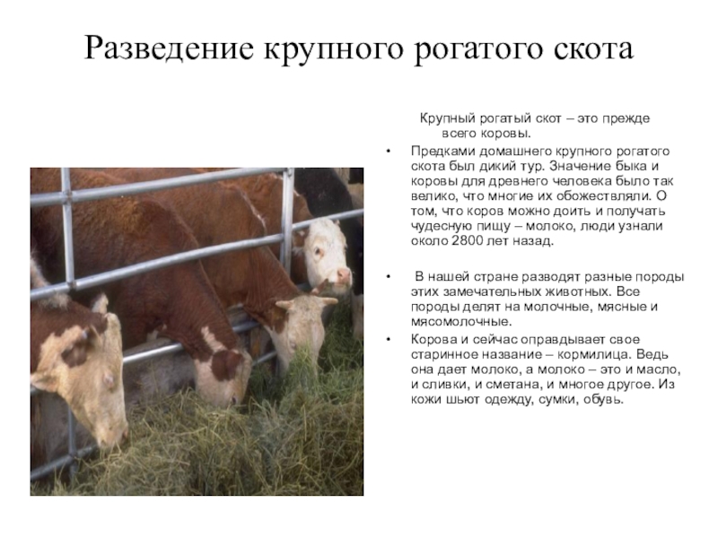 Корова и сейчас оправдывает свое старинное название – кормилица. Ведь она дает молоко, а молоко – это и масло, и сливки, и сметана, и многое другое. Из кожи шьют одежду, сумки, обувь.