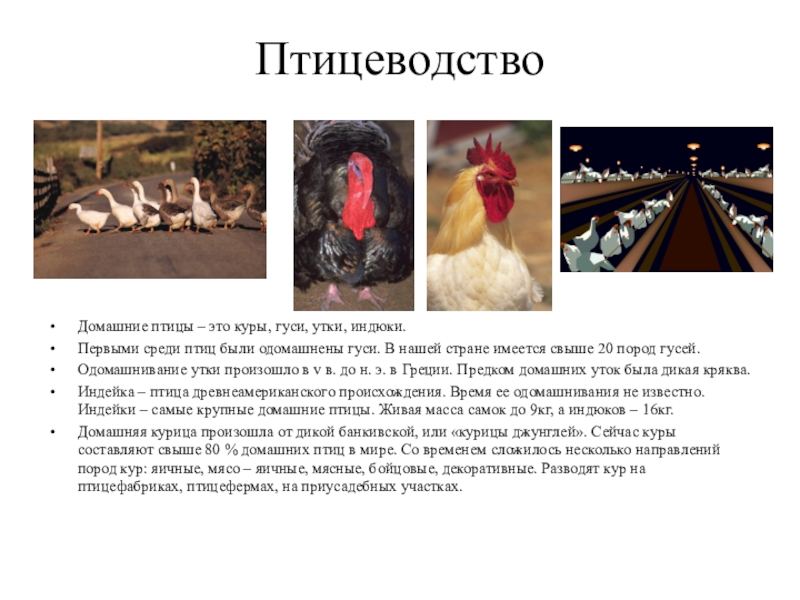 Домашняя курица произошла от дикой банкивской, или «курицы джунглей». Сейчас куры составляют свыше 80 % домашних птиц в мире. Со временем сложилось несколько направлений пород кур: яичные, мясо – яичные, мясные, бойцовые, декоративные. Разводят кур на птицефабриках, птицефермах, на приусадебных участках.
