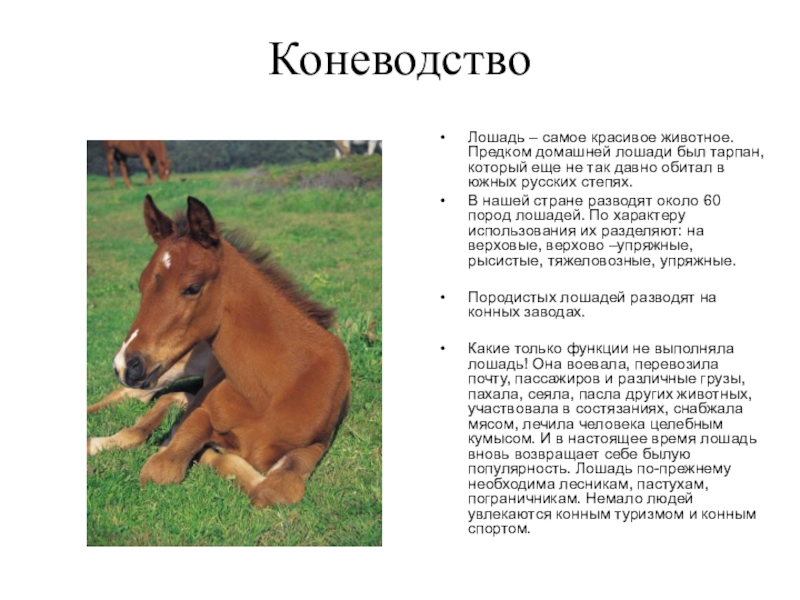 Какие только функции не выполняла лошадь! Она воевала, перевозила почту, пассажиров и различные грузы, пахала, сеяла, пасла других животных, участвовала в состязаниях, снабжала мясом, лечила человека целебным кумысом. И в настоящее время лошадь вновь возвращает себе былую популярность. Лошадь по-прежнему необходима лесникам, пастухам, пограничникам. Немало людей увлекаются конным туризмом и конным спортом.