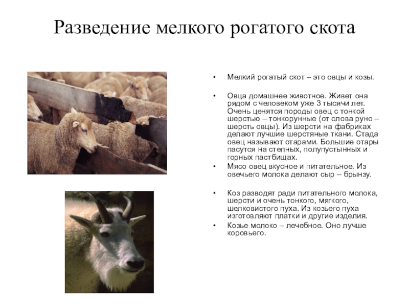 домашнее животное. Живет она рядом с человеком уже 3 тысячи лет. Очень ценятся породы овец с тонкой шерстью – тонкорунные (от слова руно – шерсть овцы). Из шерсти на фабриках делают лучшие шерстяные ткани. Стада овец называют отарами. Большие отары пасутся на степных, полупустынных и горных пастбищах.
