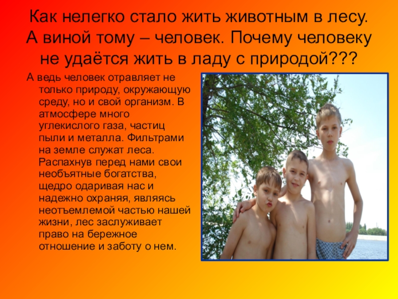 А ведь человек отравляет не только природу, окружающую среду, но и свой организм. В атмосфере много углекислого газа, частиц пыли и металла. Фильтрами на земле служат леса. Распахнув перед нами свои необъятные богатства, щедро одаривая нас и надежно охраняя, являясь неотъемлемой частью нашей жизни, лес заслуживает право на бережное отношение и заботу о нем.