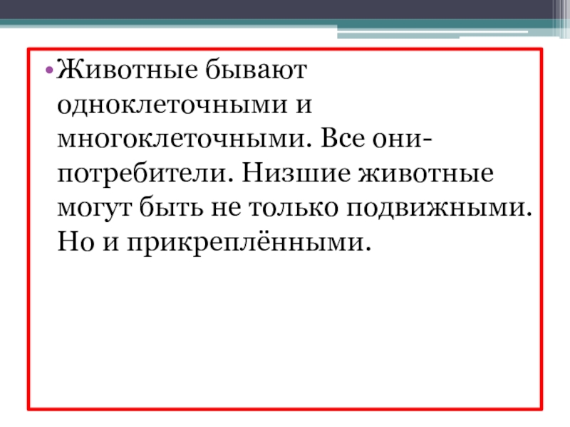 Животные- это не только звери, но и птицы, рыбы, насекомые. Простейшие животные очень маленькие и состоят всего из одной клетки.