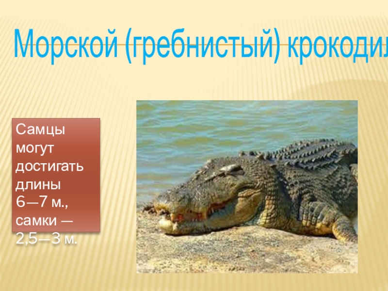 Морской (гребнистый) крокодилСамцы могут достигать длины 6—7 м., самки — 2,5—3 м.