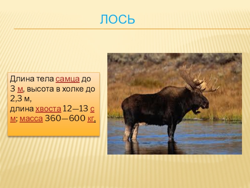 лосьДлина тела самца до 3 м, высота в холке до 2,3 м, длина хвоста 12—13 см; масса 360—600 кг.