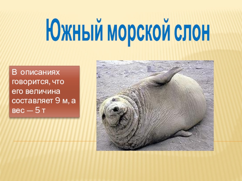 Южный морской слон В описаниях говорится, что его величина составляет 9 м, а вес — 5 т
