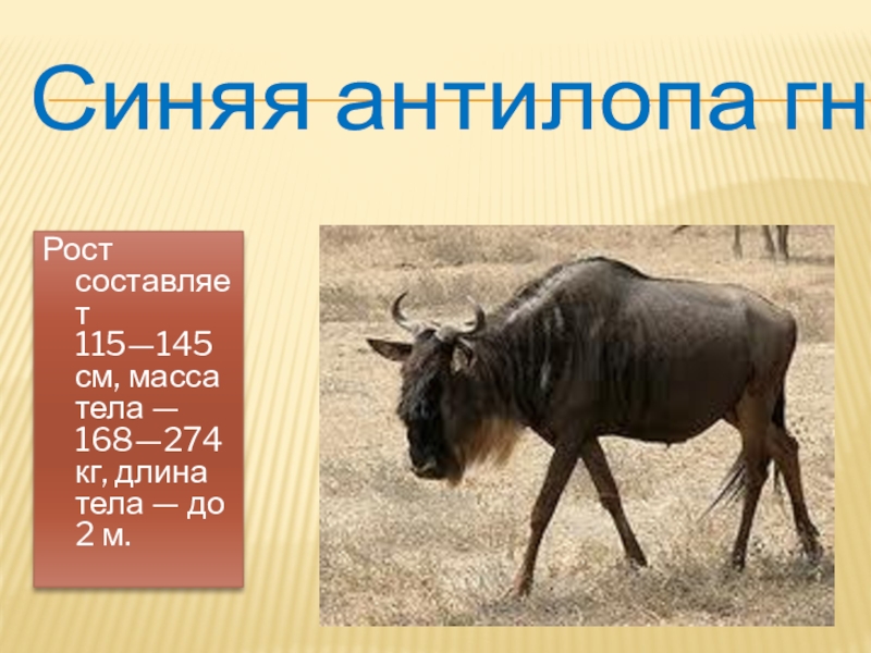 Синяя антилопа гнуРост составляет 115—145 см, масса тела — 168—274 кг, длина тела — до 2 м.