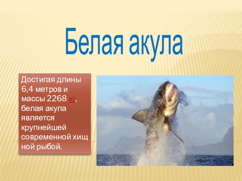 Белая акулаДостигая длины 6,4 метров и массы 2268 кг, белая акула является крупнейшей современной хищной рыбой.