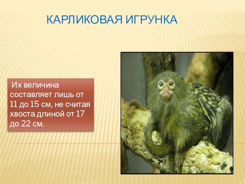 Карликовая игрунка Их величина составляет лишь от 11 до 15 см, не считая хвоста длиной от 17 до