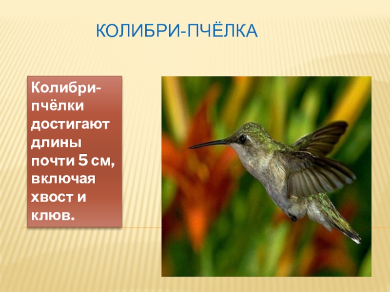 Колибри-ПчёлкаКолибри-пчёлки достигают длины почти 5 см, включая хвост и клюв.