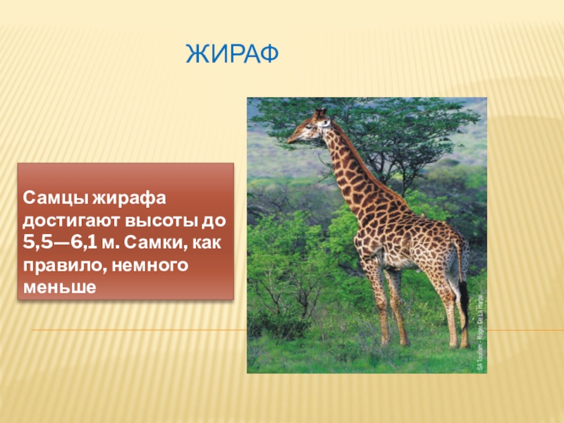 жирафСамцы жирафа достигают высоты до 5,5—6,1 м. Самки, как правило, немного меньше